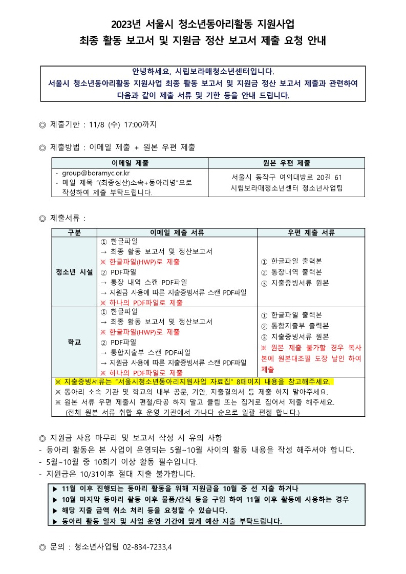 [µ¿¾Æ¸®Áö¿ø»ç¾÷] 2023³â ¼¿ï½Ã û¼Ò³âµ¿¾Æ¸®È°µ¿Áö¿ø»ç¾÷ ÃÖÁ¾ Ȱµ¿ º¸°í¼ ¹× Áö¿ø±Ý Á¤»ê º¸°í¼ Á¦Ã⠾ȳ» | |||