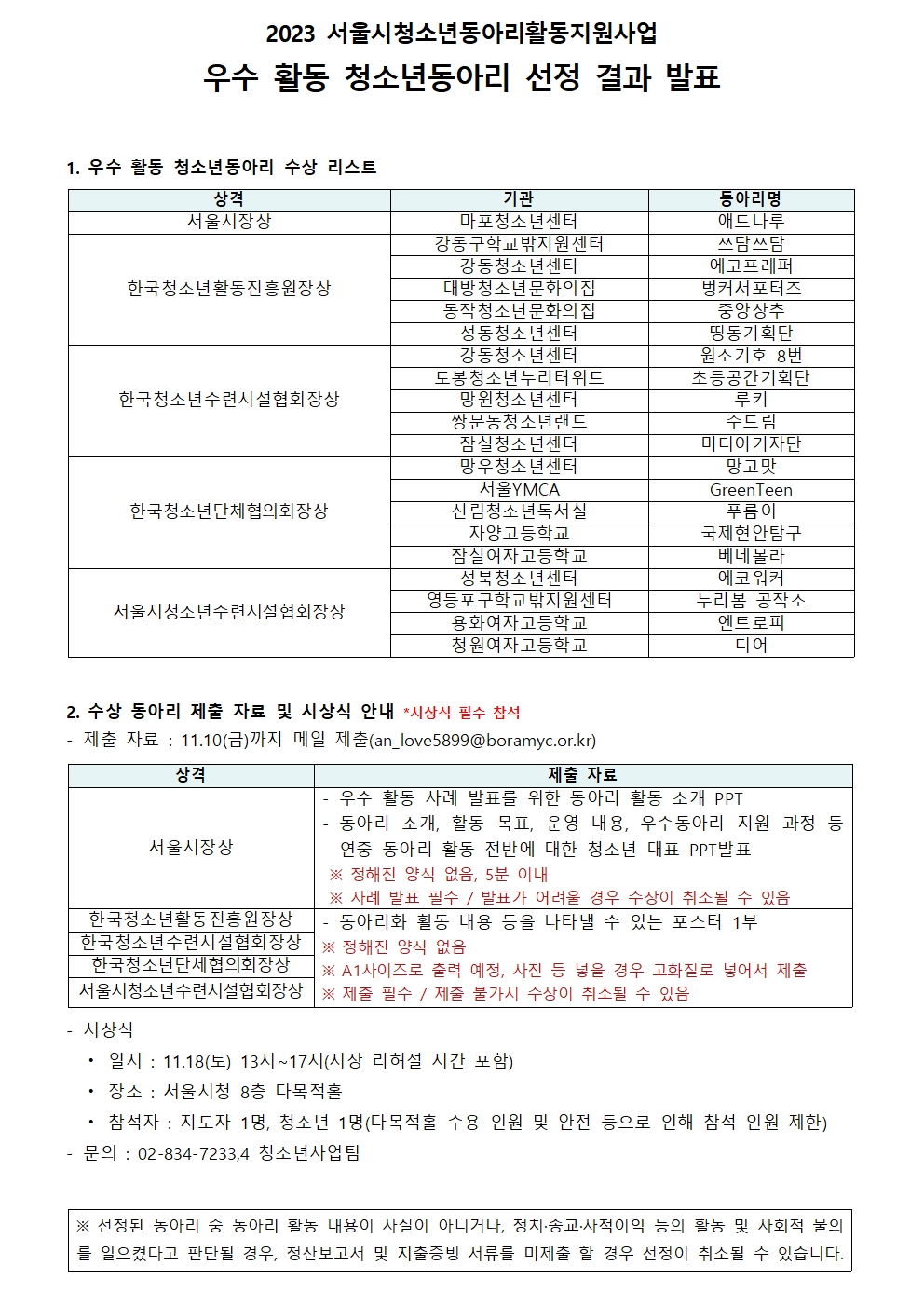 [µ¿¾Æ¸®Áö¿ø»ç¾÷] 2023³â ¼¿ï½Ã û¼Ò³âµ¿¾Æ¸®È°µ¿Áö¿ø»ç¾÷ ¿ì¼ö Ȱµ¿ µ¿¾Æ¸® ¼±Á¤ °á°ú ¹× ½Ã»ó½Ä ¾È³» | |||