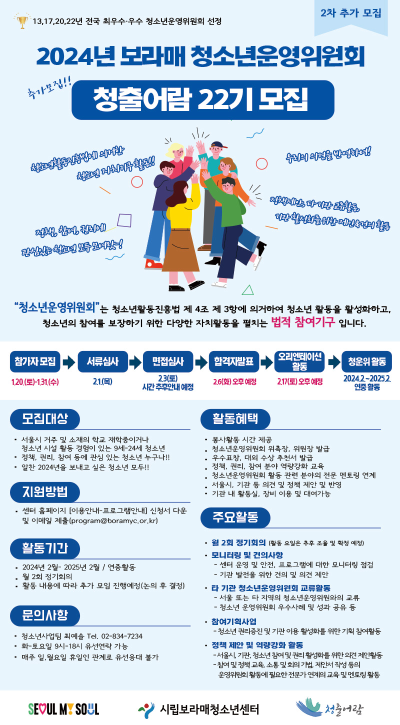 | [¸ðÁý] 2024³â û¼Ò³â¿î¿µÀ§¿øÈ¸ - ûÃâ¾î¶÷ 22±â ½Å±ÔÀ§¿ø Ãß°¡ ¸ðÁý ¾È³» | |||