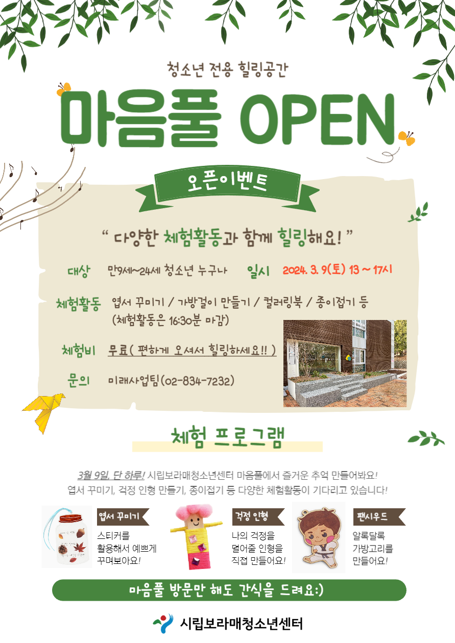 | [¾È³»] û¼Ò³âÀü¿ë Èú¸µ°ø°£ '¸¶À½Ç®' ¿ÀÇÂ!! | |||
