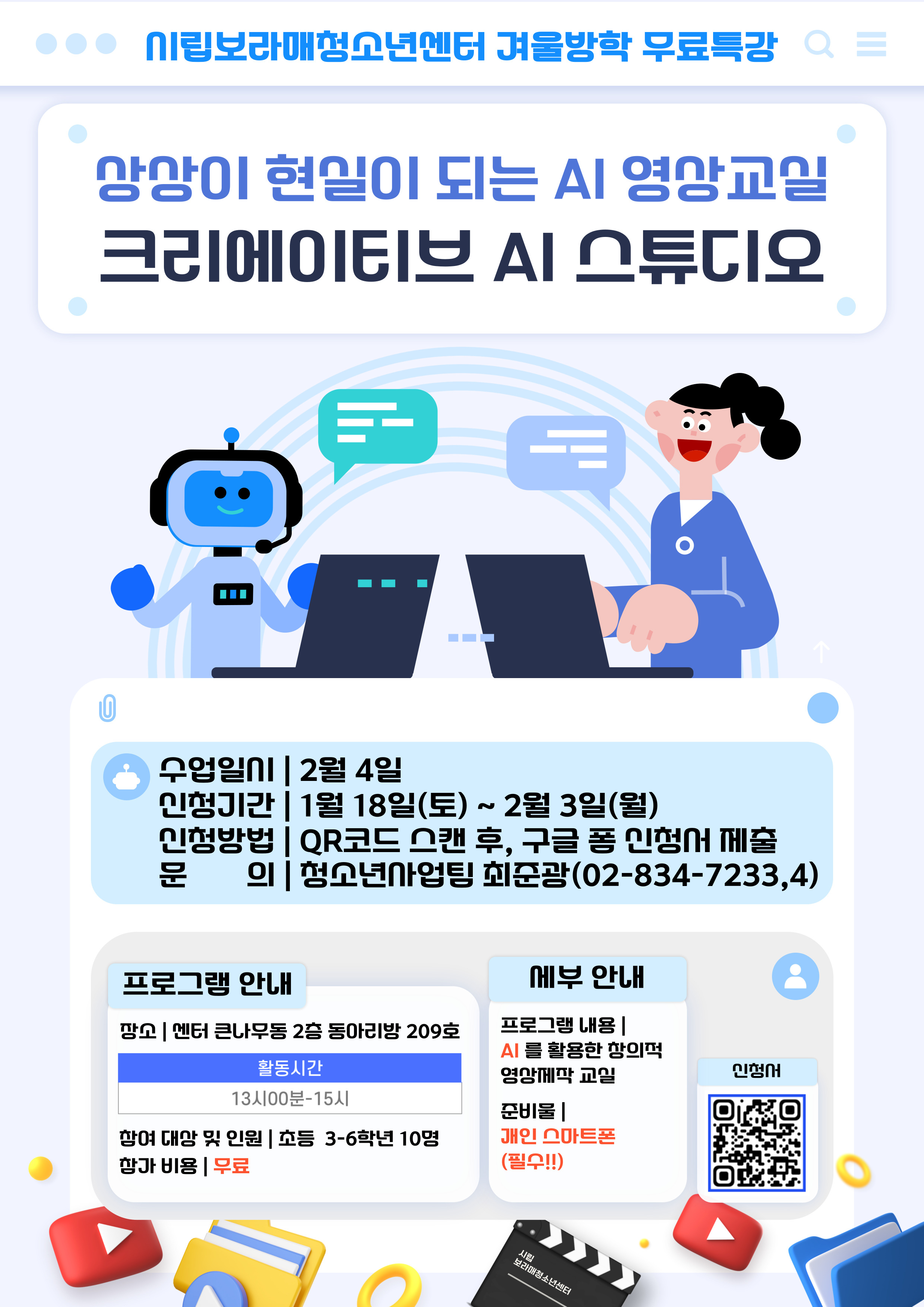 | [¸ðÁý] °Ü¿ï¹æÇРƯ° - »ó»óÀÌ Çö½ÇÀÌ µÇ´Â AI ¿µ»ó ±³½Ç [Å©¸®¿¡ÀÌÆ¼ºê AI ½ºÆ©µð¿À] ÇÁ·Î±×·¥ Âü°¡ÀÚ ¸ðÁý | |||