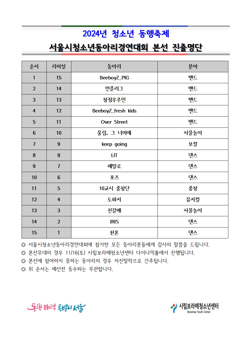 [µ¿¾Æ¸®Áö¿ø»ç¾÷] 2024 ¼¿ï½Ã û¼Ò³â µ¿¾Æ¸® °æ¿¬´ëȸ [µ¿ÇàÃàÁ¦ - S.Y.S. Seoul Youth Superstar] º»¼± ÁøÃâ µ¿¾Æ¸® È®Á¤ ¾È³» | |||