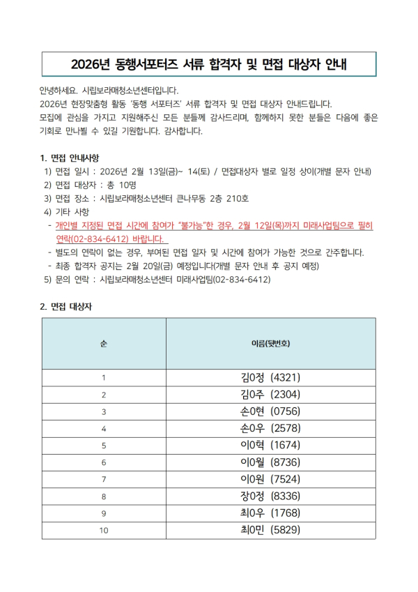| [¾È³»] 2026³â ÇöÀå¸ÂÃãÇü Ȱµ¿ µ¿Çà ¼Æ÷ÅÍÁî ¼·ù ÇÕ°ÝÀÚ ¹× ¸éÁ¢ ´ë»óÀÚ ¾È³» | |||