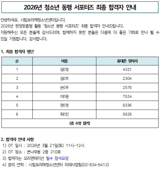| [¾È³»] 2026³â ÇöÀå¸ÂÃãÇüȰµ¿ µ¿Çà¼Æ÷ÅÍÁî ÃÖÁ¾ ÇÕ°ÝÀÚ ¾È³» | |||