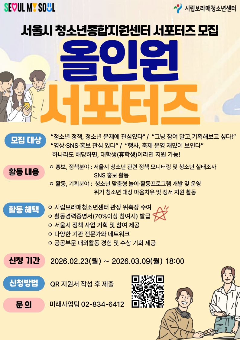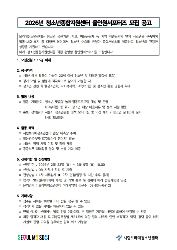 | [¸ðÁý] 2026³â û¼Ò³âÁ¾ÇÕÁö¿ø¼¾ÅÍ ¿ÃÀοø¼Æ÷ÅÍÁî ¸ðÁý | |||