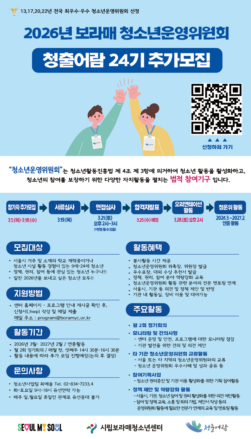 | [¸ðÁý] 2026³â º¸¶ó¸Åû¼Ò³â¿î¿µÀ§¿øÈ¸ ûÃâ¾î¶÷ 24±â ½Å±Ô À§¿ø Ãß°¡ ¸ðÁý | |||